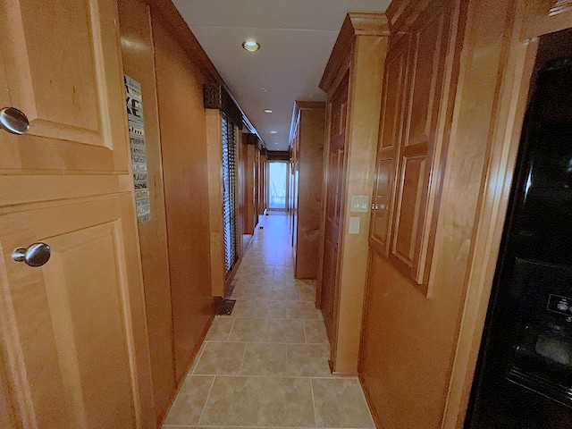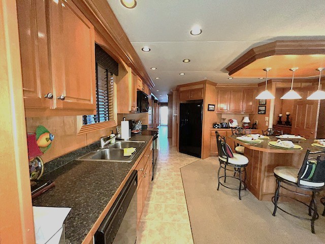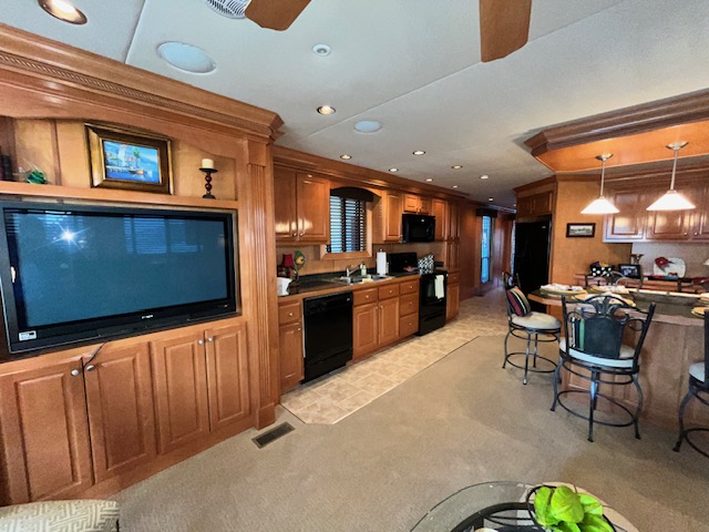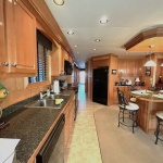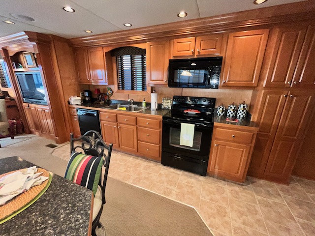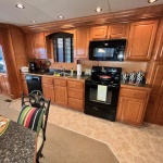 Full electric galley with black appliances: Electric refrigerator 30” solid surface range, microwave. A 27” stack washer/dryer is in the laundry closet located in the hall.