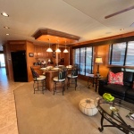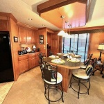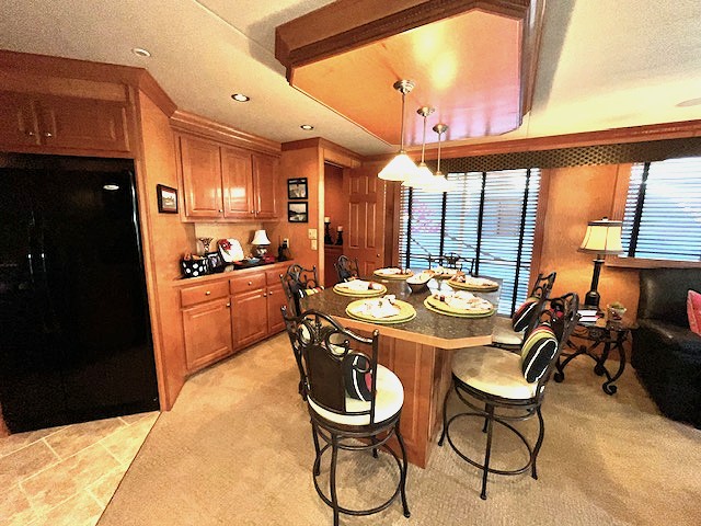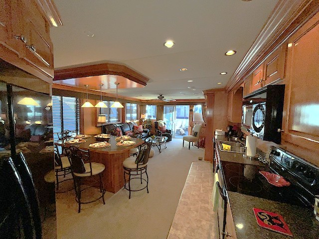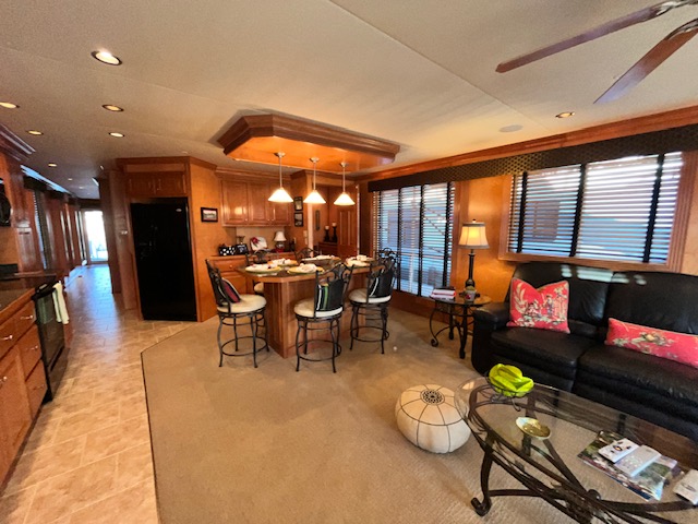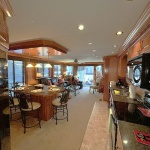 Large salon with custom entertainment system, flat panel TV. Leather sofa and recliner. Beautiful natural Maple interior hardwood and solid cabinets, complimented with solid wood panel doors and dental crown molding throughout. 6 place bar height dinette with storage.