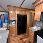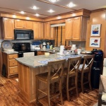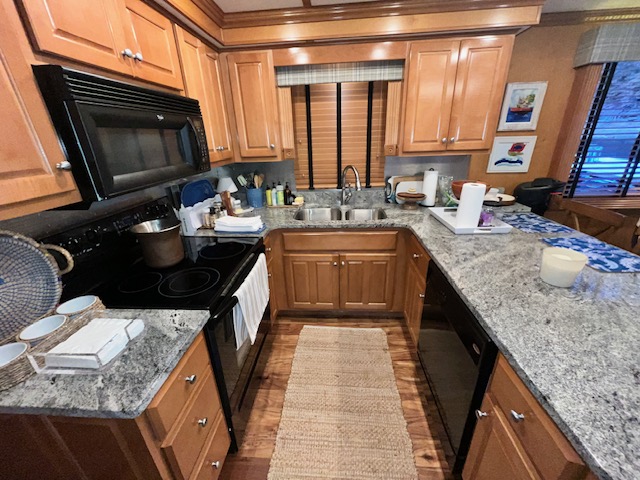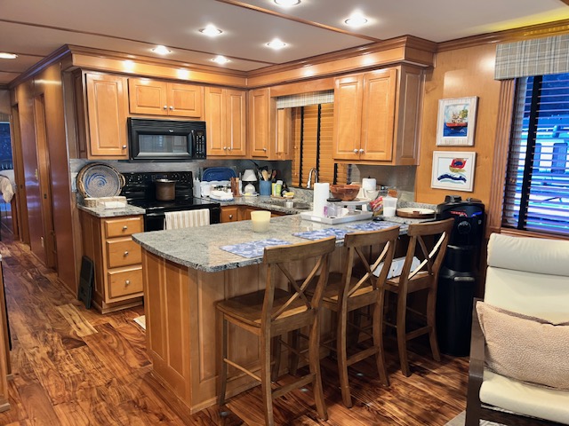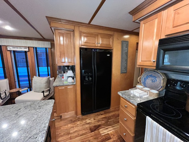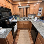 Full electric galley with black appliances: Electric refrigerator 30” solid surface range, microwave, dishwasher. Granite counter-tops and tile back splash.