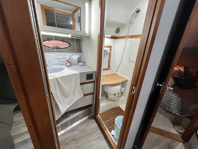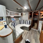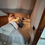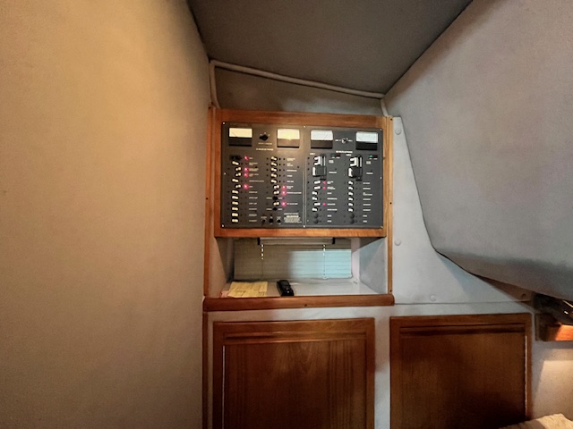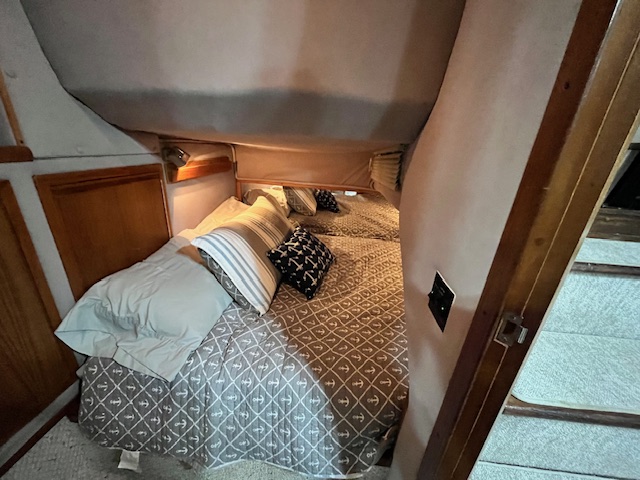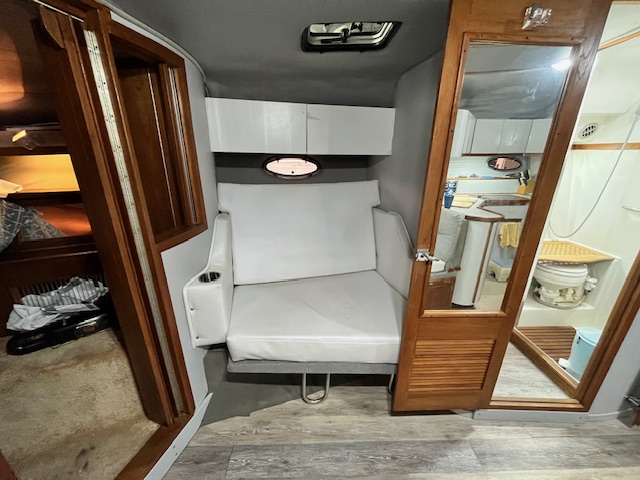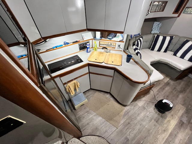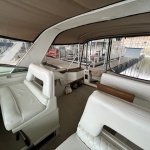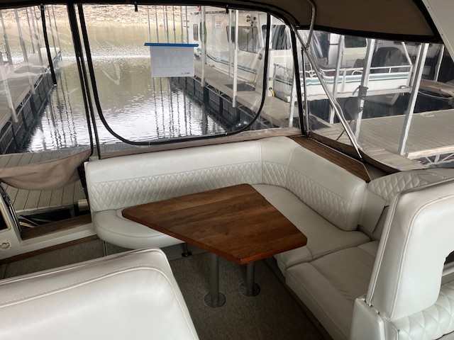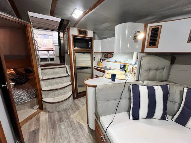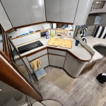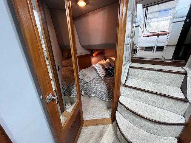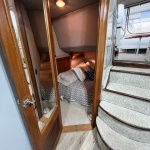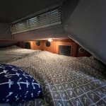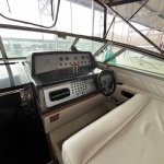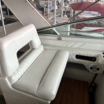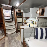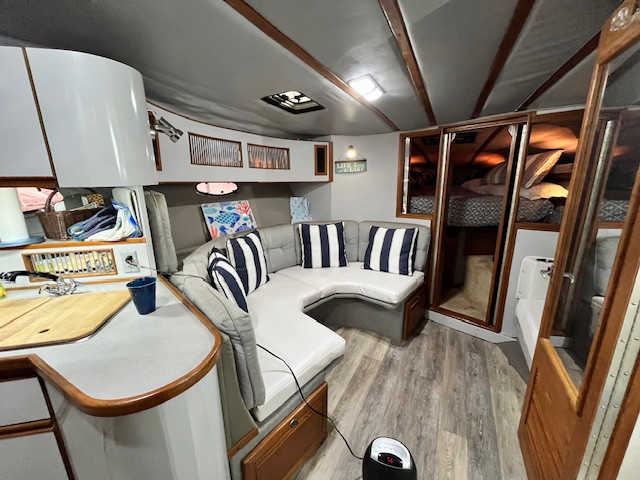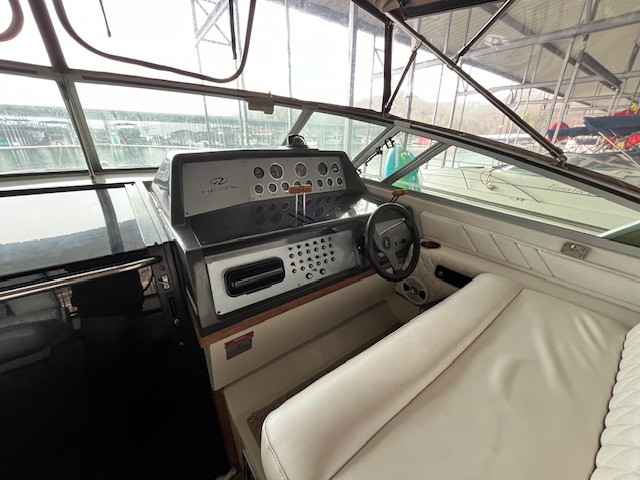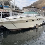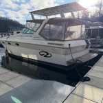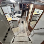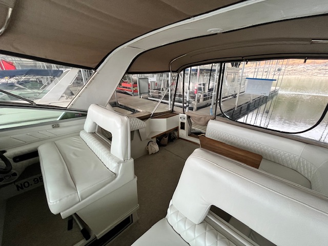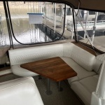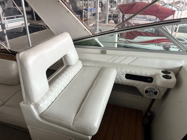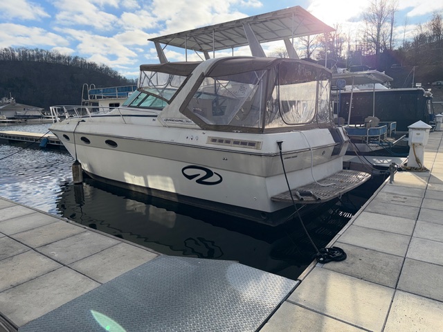 Mechanical: Twin 7.4 Liter Mercruiser’s with Velvet V-drives Quick Sliver 6.5 gen-set. Cable controls. Electrical: Dual 30-amp shore power Exterior: Full control helm Full Camper enclosure 2ft Teak Swim Platform w/ boarding ladder Recent exterior cockpit upholstery. Bottom paint in 2020. Interior: Light gray interior & cabinets with Holly trim accents. LVP inlay in galley and baths. 1 aft birth and V birth. Wet head with marine toilet. Galley: Appliances: Electric Refrigerator, microwave, and cook-top. Heating and Cooling Marine heat and air.