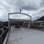 Top side features, Custom sunlounge flybridge with 12ft fiberglass top and additional 30ft fiberglass party-top and roof mounted New 4-ton HVAC system.