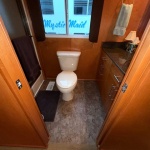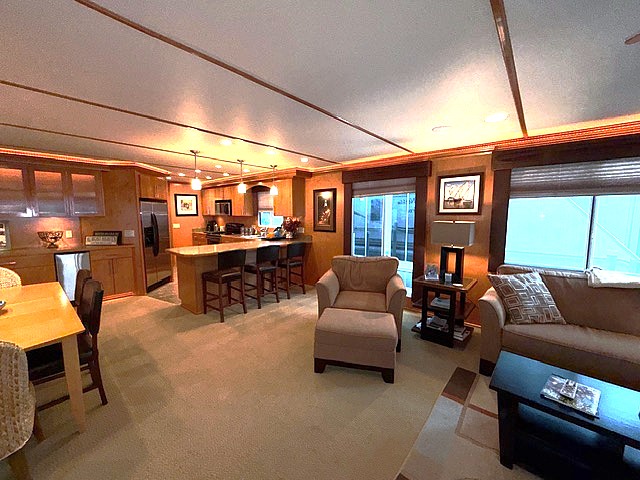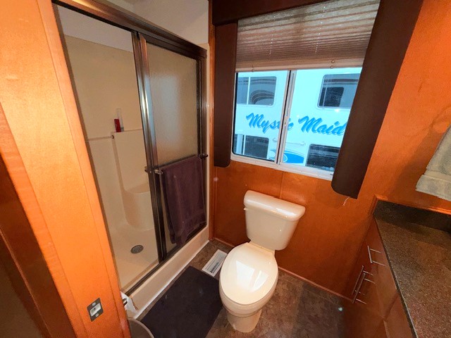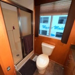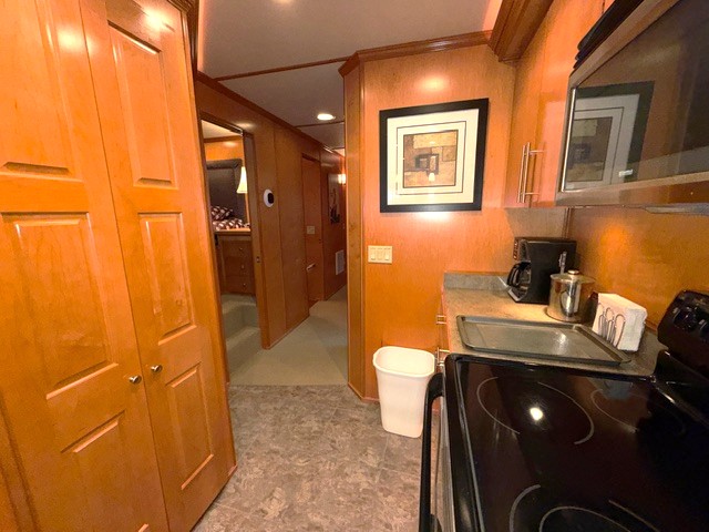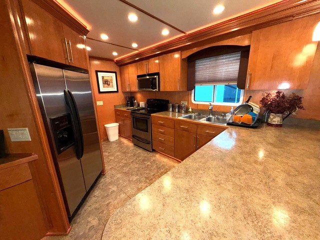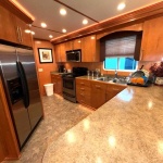 Fully insulated and features a spacious salon with plenty of room for large families or entertaining guests. Custom honey maple entertainment center with flat panel TV, custom furnishings, hardwood paneling, crown molding, shaker style solid wood doors and cabinets. Port side full electric L shape style galley that includes 3-place bar and 6-place dinette with Side-by-Side Refrigerator, Solid surface range, microwave, stainless dishwasher additional and compactor.
