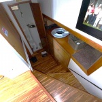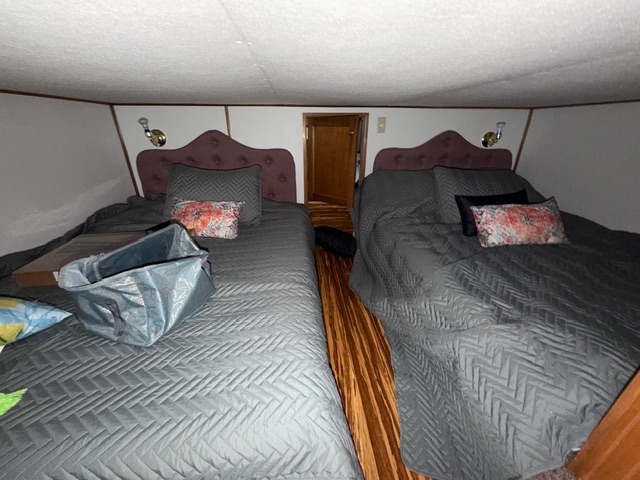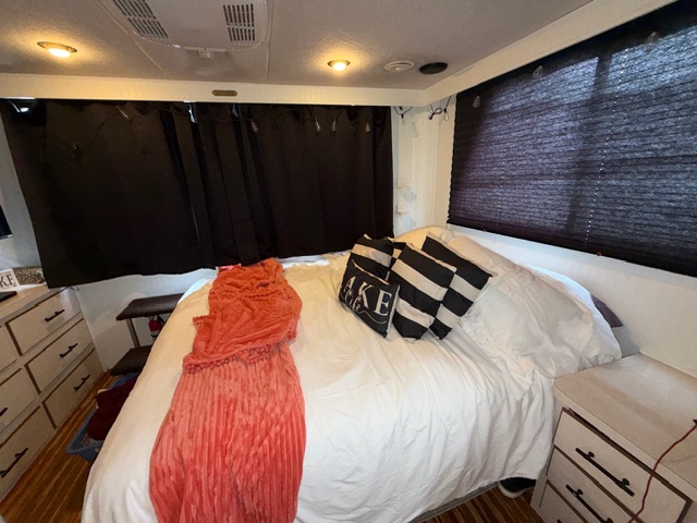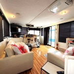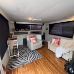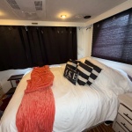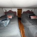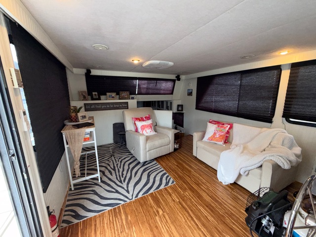Spacious salon with sofa and club chair. Full electric galley with Refrigerator, cooktop and microwave. The forward lower stateroom features a 1/2 bath and two full beds. Aft stateroom features a full-size bed and full bath with a shower.