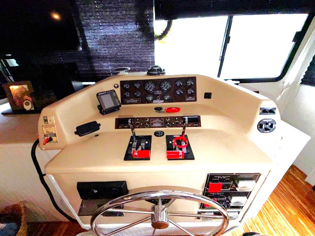 Flybridge with canvas Bimini. Dual roof heat and air units.